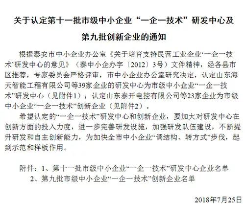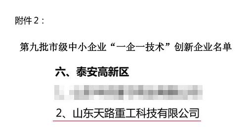 近日,根據(jù)泰安市中小企業(yè)辦公室《關(guān)于培育支持民營工業(yè)企業(yè)‘一企一技術(shù)’研發(fā)中心的意見》及相關(guān)文件精神,山東天路重工科技有限公司被認定為市級中小企業(yè)“一企一技術(shù)”創(chuàng)新企業(yè)。