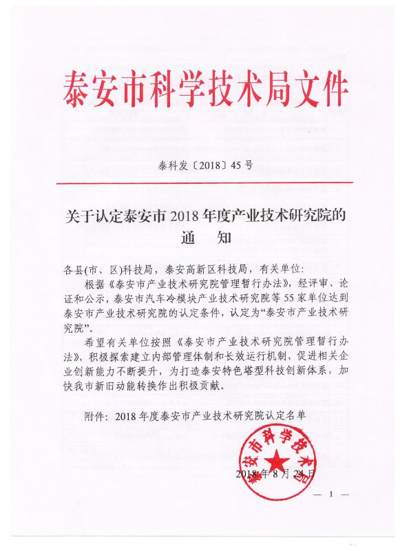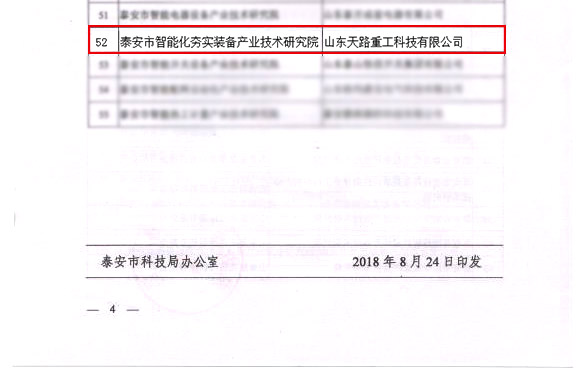 近日,根據(jù)《泰安市產(chǎn)業(yè)技術(shù)研究院管理暫行辦法》,經(jīng)評審,論證和公示,山東天路重工科技有限公司達到泰安市產(chǎn)業(yè)技術(shù)研究院的認定條件,認定為“泰安市產(chǎn)業(yè)技術(shù)研究院”。