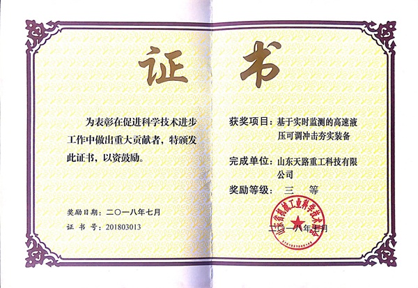 近日,山東省機械工業(yè)科學技術(shù)協(xié)會依據(jù)《山東省科學技術(shù)獎勵辦法》,公布2018年度山東省機械工業(yè)科技進步獎評選結(jié)果,天路重工報送的“基于實時監(jiān)測的高速液壓可調(diào)沖擊夯實裝備”榮獲“2018年度山東省機械工業(yè)科技進步獎”三等獎。