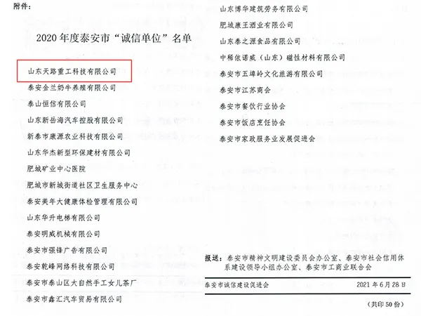 經(jīng)過嚴格審核,山東天路重工科技有限公司等二十幾家企業(yè)被評為2020年度泰安市首屆“誠信單位”。